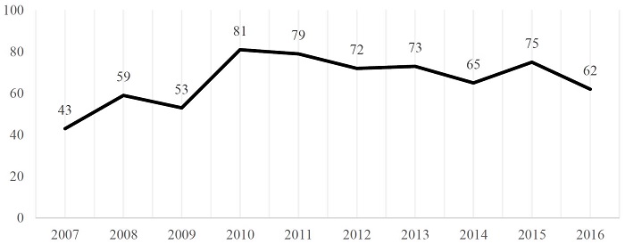 No tocante ao quantitativo por ano da produção, apresenta-se na Figura 1 a evolução anual no período investigado.