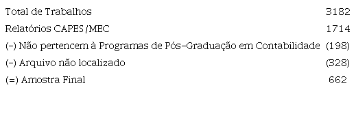 Deste montante, foram descartados os trabalhos não oriundos de programas de pós-graduação em contabilidade e os que não estavam disponíveis das bases de dados de consulta pública, como o banco de teses da CAPES, a plataforma sucupira e os repositórios científicos das instituições dos referidos programas. Sendo assim, a amostra final analisada nesta pesquisa corresponde a 662 trabalhos, conforme verifica-se na Tabela 1, que apresenta os critérios de seleção adotados. Cabe ressaltar que a coleta dos trabalhos se deu do dia 20 de abril ao dia 15 de maio de 2017.