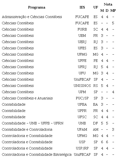 A maioria dos programas de pós-graduação listados possui nota de avaliação 4, mediante o número de 10 dos 20 mestrados acadêmicos e 10 dos 12 doutorados. O programa mais bem classificado é o da Universidade de São Paulo (USP), que possui nota 6 em seu mestrado acadêmico e doutorado. A USP é uma instituição de referência no campo acadêmico nacional e seu programa de pós-graduação em Controladoria e Contabilidade, vinculado ao Departamento de Contabilidade e Atuária, da Faculdade de Economia e Administração (FEA), é o mais antigo programa de pós-graduação em ciências contábeis do Brasil (USP, 2017).