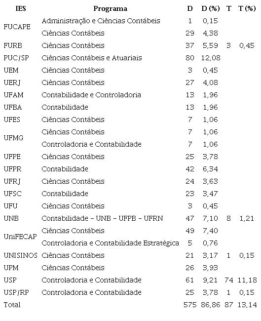 Das 662 produções encontradas, entre teses e dissertações, 135, ou seja, mais de 20% do total, foram produzidas no Programa de Pós-graduação em Controladoria e Contabilidade da USP, sinalizando-a como a instituição de maior produção acadêmica da área, corroborando o fato desta ser a instituição que apresenta maior nota na avaliação da CAPES. Produção significativa também é observada no Programa de Pós-Graduação em Ciências Contábeis e Atuariais da Pontifícia Universidade Católica de São Paulo (PUC-SP), mediante o percentual de cerca de 12% da produção total, que corresponde a 80 dissertações.