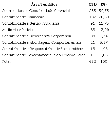 Na Tabela 4, são evidenciadas as temáticas que comportam as produções levantadas. Por esse indicador, vislumbram-se as tendências de pesquisa em contabilidade, percebendo-se que o tema mais pesquisado constitui o de Controladoria e Contabilidade Gerencial, com quase 40% do total, seguido de Contabilidade Financeira, com cerca de 20%, e Contabilidade e Gestão Tributária e Auditoria e Perícia, ambos os temas com mais de 13% do total.