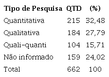 Em relação ao tipo de pesquisa, identificou-se percentuais aproximados para a adoção das abordagens qualitativa e quantitativa, porém o uso desta última prevaleceu. Se levada em consideração a soma da sua utilização isolada, 32,48%, e em combinação com a qualitativa, 15,71%, totaliza-se o percentual de mais de 48%. Pode-se refletir que esse resultado está relacionado à tentativa de maior aproximação das ciências sociais aplicadas com o paradigma positivista, que prevê a utilização de dados objetivamente processados com o apoio de métodos quantitativos (DEMO, 2009).