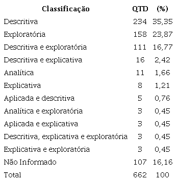Observa-se um número expressivo de pesquisas de caráter descritivo e exploratório. Ao somar os índices de trabalhos que utilizaram essas tipologias de forma isolada ou em combinação com elas mesmas ou com outras classificações, chega-se a um percentual de mais de 78%. Sampieri, Collado e Lúcio (2013), ao tratarem das pesquisas exploratória e descritiva, consideram que a primeira precede a segunda como etapas de um processo. Dessa forma, as pesquisas exploratórias são realizadas quando o objetivo consiste em examinar um tema ou problema pouco estudado, do qual se tem muitas dúvidas, e serve para preparar o campo para se realizar pesquisas descritivas, as quais objetivam dizer como é e como se manifesta determinado fenômeno (SAMPIERI; COLLADO; LÚCIO, 2013).