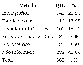Quanto ao método de pesquisa, notou-se que os trabalhos analisados possuíam um direcionamento maior para a pesquisa de campo, já que esta propicia contato com atores concretos da realidade estudada. Foi possível verificar ainda que esses estudos adotam como preferência a técnica de coleta de dados do tipo documental e procedimentos estatísticos para a análise de dados.