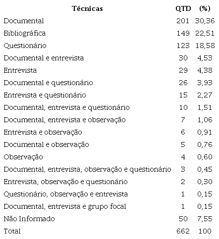 As técnicas de coleta de dados mais empregadas foram as pesquisas documental (42%) e bibliográfica (22%) e o questionário (27%). Acredita-se que a maior utilização de pesquisa documental ocorreu face à análise de demonstrações contábeis das empresas, o que se observou em grande parte dos estudos, corroborando os resultados de Oliveira e Boente (2012). Segundo Godoy (1995), a pesquisa documental consiste num instrumento de apoio baseado na investigação em fontes primárias de pesquisa. Percebeu-se ainda, em cerca de 25% da produção, a combinação de várias técnicas, fato que proporciona enriquecimento à pesquisa (COOPER; SCHINDLER, 2011; COLLIS; HUSSEY, 2005; GRAY, 2012).