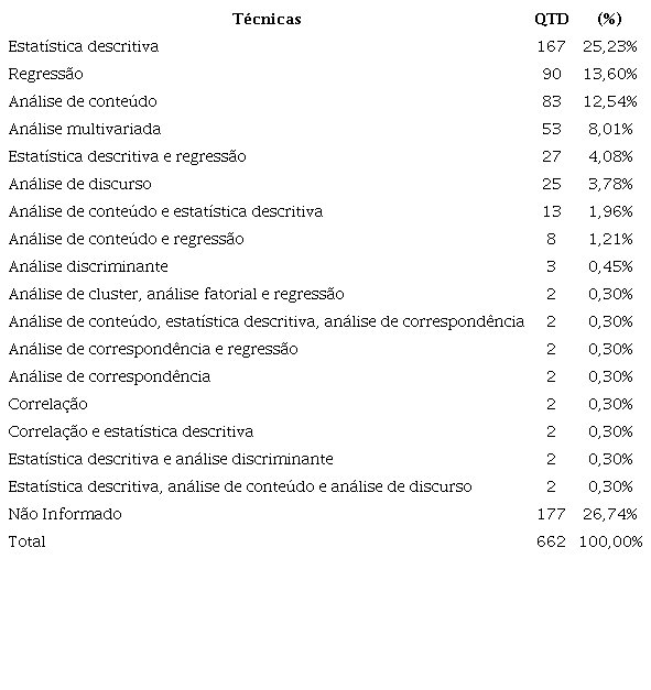 Observa-se que, por existir uma gama maior de pesquisas quantitativas nos estudos analisados, consequentemente, as principais técnicas de análise de dados empregadas estão fundamentadas em procedimentos estatísticos. Cabe ressaltar a frequência mais alta, em torno de 32%, encontrada na estatística descritiva, seguida da regressão, com mais de 15%.