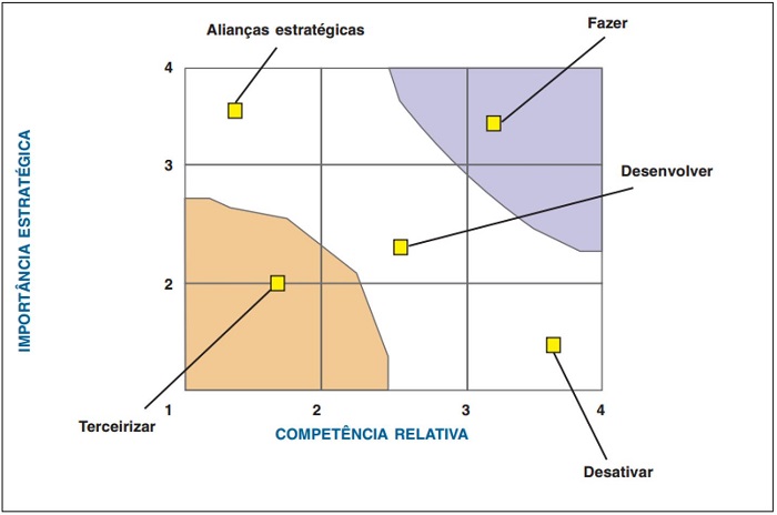 A Figura 5 ilustra um dos modelos de análise sobre decisões de fazer ou comprar considerando duas variáveis: competência relativa e importância estratégica.