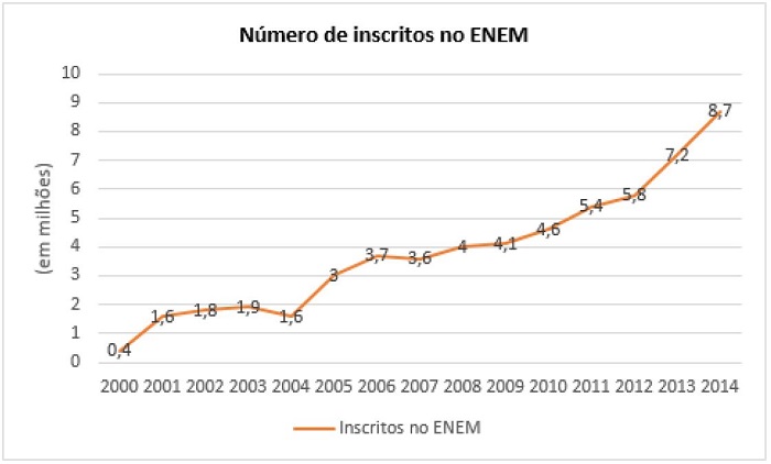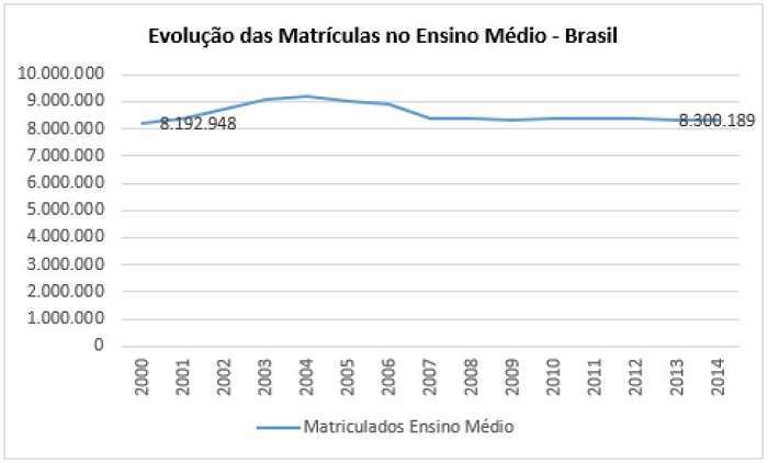 Em contrapartida ao aumento significativo da demanda pelo Exame, o crescimento do número de estudantes matriculados no ensino médio, principal público do ENEM, estagnou-se no período. Segundo o MEC (http://portal.inep.gov.br/basica-censo-escolar-sinopse-sinopse, acesso em 12/08/2015 às 17h20), os matriculados no ensino médio cresceram 1,30% de 2000 até 2014. Em números absolutos, houve um aumento de 8.192.948 para 8.300.189 estudantes. O Gráfico 2 ilustra a evolução das matrículas de estudantes do ensino médio no Brasil.