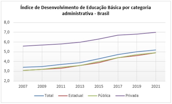 O Índice de Desenvolvimento de Educação Básica (IDEB) foi criado em 2007 para aferir, em uma escala de 1 a 10, dois conceitos de qualidade da educação básica no Brasil: aprovação e média do desempenho dos estudantes em língua portuguesa e matemática. Conforme ilustra o Gráfico 4, pode-se observar a diferença de desempenho entre escolas públicas e privadas.
