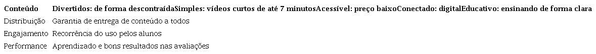 Em diversos brainstormings, Marco e seus conselheiros, idealizaram as características principais de sua empresa para aumentar a sua taxa de sucesso, visto que era algo totalmente incerto perante um mercado que até então não havia um concorrente direto. Como forma de se diferenciar de alguns concorrentes indiretos, como Coursera (EUA) ou Khan Academy (EUA), Marco se debruçou sobre quatro aspectos fundamentais para que a Descomplica consolidasse uma identidade própria. O Quadro 1 sumariza os conceitos propostos pelo empreendedor para o seu negócio.