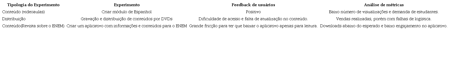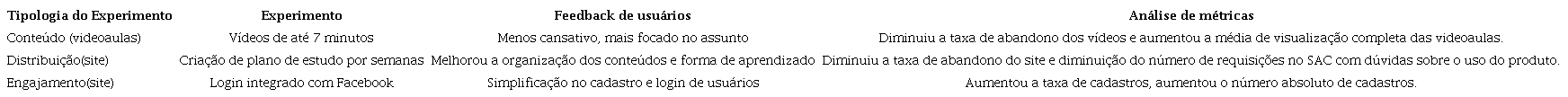 Nos casos observados no Quadro 2, os aprendizados foram validados, justificando a implementação, de forma à melhoria do produto. Em caso negativo, Marco e sua equipe declinavam da implementação e recomeçava o ciclo para desenvolvimento de novas características ou funcionalidades, respeitando sempre um tempo de uma a duas semanas entre suas iterações para garantir seu desenvolvimento ágil e uma inovação contínua de produto. O Quadro 3 sumariza alguns dos aprendizados invalidados de Marco e sua equipe em 2011.