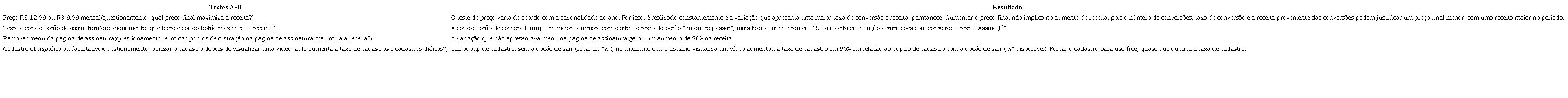 O Quadro 4 apresenta exemplos de testes realizados para otimização do site em 2012. A taxa de significância estatística6 utilizada foi de 95%.