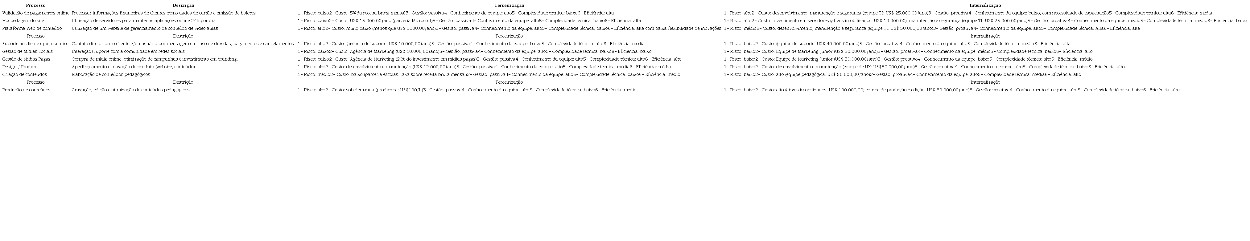 Alguns dias depois, em uma reunião, Marco e seus diretores levantaram alguns processos essenciais (Quadro 6) que a empresa Descomplica precisava definir a respeito de fazer ou comprar, para que se pudesse dar continuidade à proposta organizacional. Para contribuir no processo decisório, a equipe caracterizou as atividades de acordo com seis distintos critérios; (1) risco baixo, médio ou alto; (2) custo - valor efetivo da atividade no período de um ano; (3) gestão - passiva, ativa ou proativa; (4) conhecimento da equipe: - baixo, médio ou alto; (5) complexidade técnica - baixo, médio ou alto; (6) eficiência- baixo, médio ou alto.