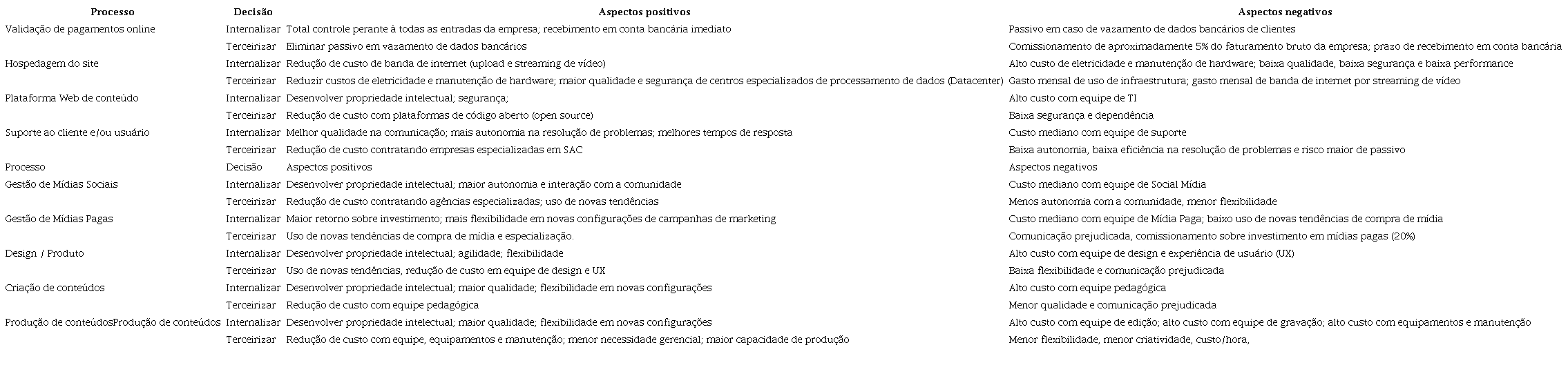 Considerando-se a proposta, orçamento e reputação do empreendimento estudado, quais processos da empresa você terceirizaria e quais você internalizaria? Crie uma tabela com aspectos positivos e negativos para cada decisão.