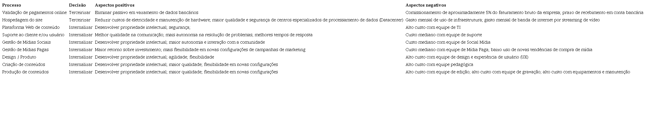 Os processos centrais destacados pela equipe precisavam ser analisados de forma a levar em consideração a missão e visão da empresa, aspectos positivos e negativos das decisões a serem tomadas, considerando-se também os seis critérios adotados. Teria a Descomplica capacidade de internalizar todos os processos críticos do negócio? Valeria a pena subcontratar outras empresas para cuidarem de aspectos centrais da startup? Com um modelo definido, estaria a empresa apta a atender com qualidade milhões de usuários diariamente? A internalização das atividades complica ou descomplica o desenvolvimento da organização?