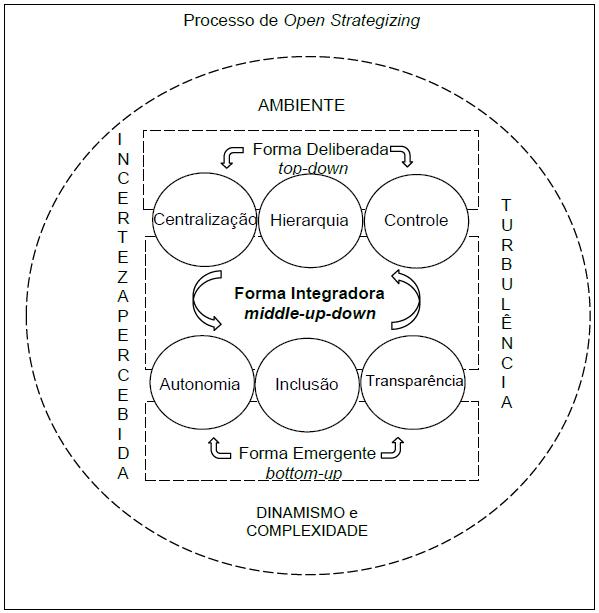 A partir da articulação entre o conceito de formação da estratégia Andersen (2004) e de open strategizing (HAUTZ, 2017), a abertura da estratégia acontece de diferentes formas. O processo de open strategizing pode ocorrer de forma deliberada, no sentido top-down; no sentido oposto, bottom-up, a partir da iniciativa dos níveis hierárquicos inferiores, de forma emergente ou autônoma; e, quando acontece de forma articulada, combinada, com práticas de inclusão das pessoas e transparência da informação, ocorre de forma integradora ou middle-up-down, atendendo às condições que são impostas pelas contingências do ambiente (ANDERSEN, 2004; JARZABKOWSKI; BALOGUN; SEIDL, 2007; WHITTINGTON; CAILLUET; YAKIS‐DOUGLAS, 2011; HAUTZ, 2017; MACK; SZULANSKI, 2017; TAVAKOLI; SCHLAGWEIN; SCHODER, 2017).