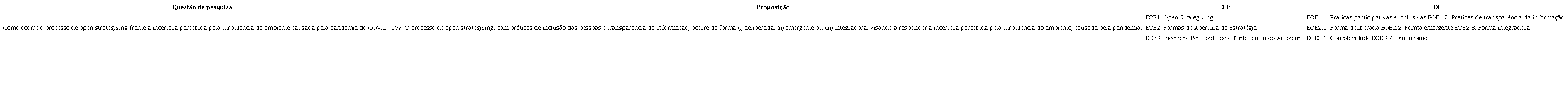 Com as reflexões teóricas apresentadas e buscando responder à questão de pesquisa inicial, elaboramos uma proposição norteadora para a fase empírica deste estudo: o processo de open strategizing, com práticas de inclusão das pessoas e transparência da informação, ocorre de forma: (i) deliberada, (ii) emergente ou (iii) integradora, visando a responder a incerteza percebida pela turbulência do ambiente, causada pela pandemia do COVID-19 (MACK; SZULANSKI, 2017; TAVAKOLI; SCHLAGWEIN; SCHODER, 2017).