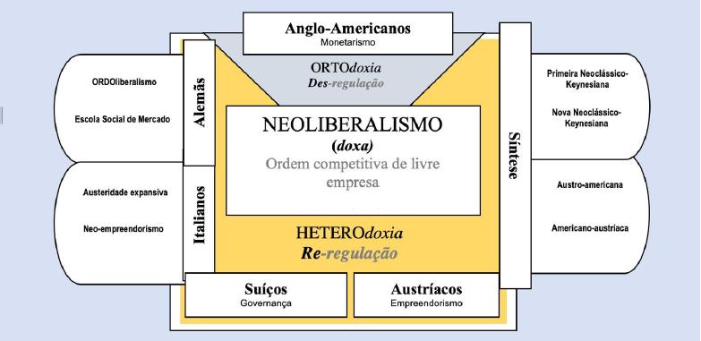 Em primeiro lugar, graças ao maior protagonismo e à gradual visibilidade das posições neoliberais heterodoxas as quais, sob uma ênfase especial durante o novo milênio, contrastam com a rejeição - inclusive, o relativo abandono - das visões neoliberais ortodoxas que foram (intra)hegemônicas desde a inauguração in vivo do neoliberalismo. Esta mudança ideológica vem evidenciando um trânsito (interno) transcendental desde as versões anglo-americanas do neoliberalismo, defensoras a limine da desregulação como forma privilegiada de ação institucional para a materialização da Sociedade de Mercado, em direção a versões do pensamento neoliberal inclinadas à regulação estatal (em função) dos mercados, ou seja, um conjunto amplo e seletivo de perspectivas austríacas, alemãs, italianas e suíças (ver Figura 1).