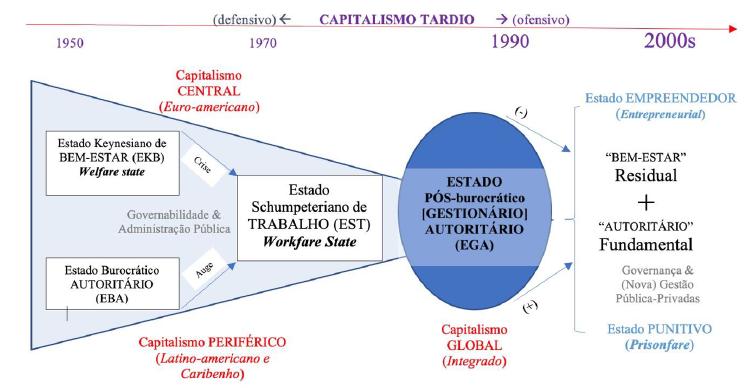 Mediante uma reconstrução histórica de longo prazo a progressiva constituição do Estado neoliberal poderia ser condensada em três (3) eixos paradigmáticos que, mesmo considerando-os como “momentos” característicos (temporais e conceituais), revelariam a marca das reconfigurações estruturais econômico políticas atuais: i) o Estado de Trabalho (Workfare state); ii) o Estado Punitivo (Prisonfare state); e iii) o Estado Empreendedor (Entrepreunerial state). No seu conjunto: o Estado Neoliberal Compreensivo (ENC), uma designação que também pode ser equivalente ao tipo de Estado Pós-burocrático Autoritário (EGA).