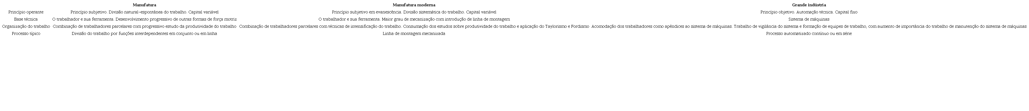 Considerando esses aspectos gerais, é possível determinar a manufatura e a grande indústria como expressões de uma unidade entre um dado grau de desenvolvimento da base técnica e uma organização do trabalho correspondente. O mesmo se diz para a manufatura moderna, como unidade entre os elementos, levando-se em conta uma variação incremental de mecanização e aplicação científica que a afasta gradativamente da manufatura clássica puramente artesanal sem, no entanto, identificar-se ao sistema de máquinas mais desenvolvido como estágio tecnologicamente superior. O destaque é que na manufatura moderna essa mecanização espelha uma aplicação progressiva da ciência no desenvolvimento tecnológico e uma descaracterização do caráter natural-espontâneo do processo de trabalho que se torna um objeto de estudo racional a serviço dos imperativos econômicos do modo de produção capitalista.