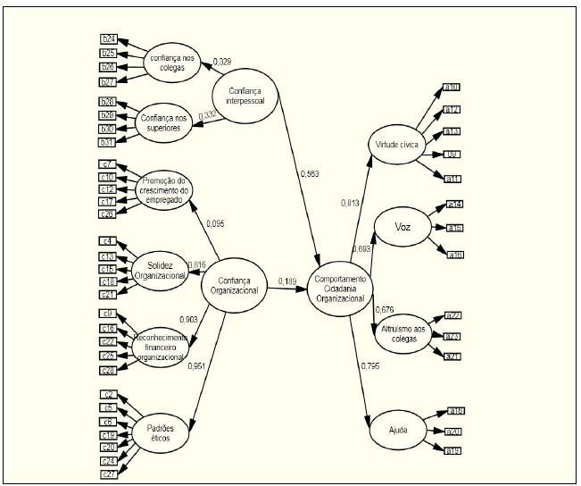 A fim de identificar a influência da Confiança Interpessoal e Confiança Organizacional sobre os Comportamentos de Cidadania Organizacional elaborou-se o modelo estrutural, sendo testados os índices de ajuste. A análise dos índices corroborou que o modelo não estava adequado. Da mesma forma que na Análise Fatorial Confirmatória, trabalhou-se com a ideia de aprimoramento do modelo, com base nas sugestões do software AMOS™. Primeiramente, foram incluídas correlações entre os erros dos fatores pertencentes ao mesmo construto. Assim, foram incluídas relações entre os erros dos fatores Ajuda e Altruísmo aos colegas, pertencentes ao construto CCO, entre os erros dos fatores Confiança nos colegas e Confiança nos superiores, pertencentes ao construto Confiança Interpessoal e entre os erros dos fatores Padrões éticos e Reconhecimento financeiro organizacional, do construto Confiança Organizacional. Como destaca Marôco (2010), pode ser plausível que a semelhança da formulação dos itens e sobreposição conceitual dos fatores justifique a existência destas correlações.