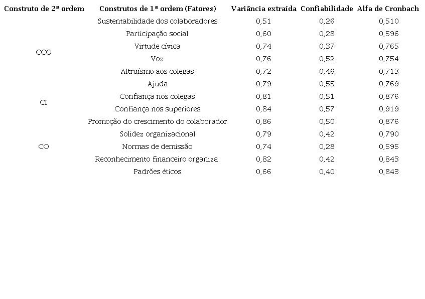 Assim, optou-se pelo cálculo do Alfa de Cronbach, para cada um dos fatores estudados. Considerando que os valores do Alfa de Cronbach são satisfatórios se apresentarem valores superiores a 0,6 (Malhotra, 2006), foram excluídos os fatores Sustentabilidade dos colaboradores (alfa 0,510) e Participação Social (alfa 0,596) da escala CCO-TC e o fator Normas de demissão (alfa 0,595) da ECEO. A Tabela 1 demonstra os construtos de 1ª e 2ª ordem, bem como a variância extraída, a confiabilidade e o Alfa de Cronbach de cada construto.