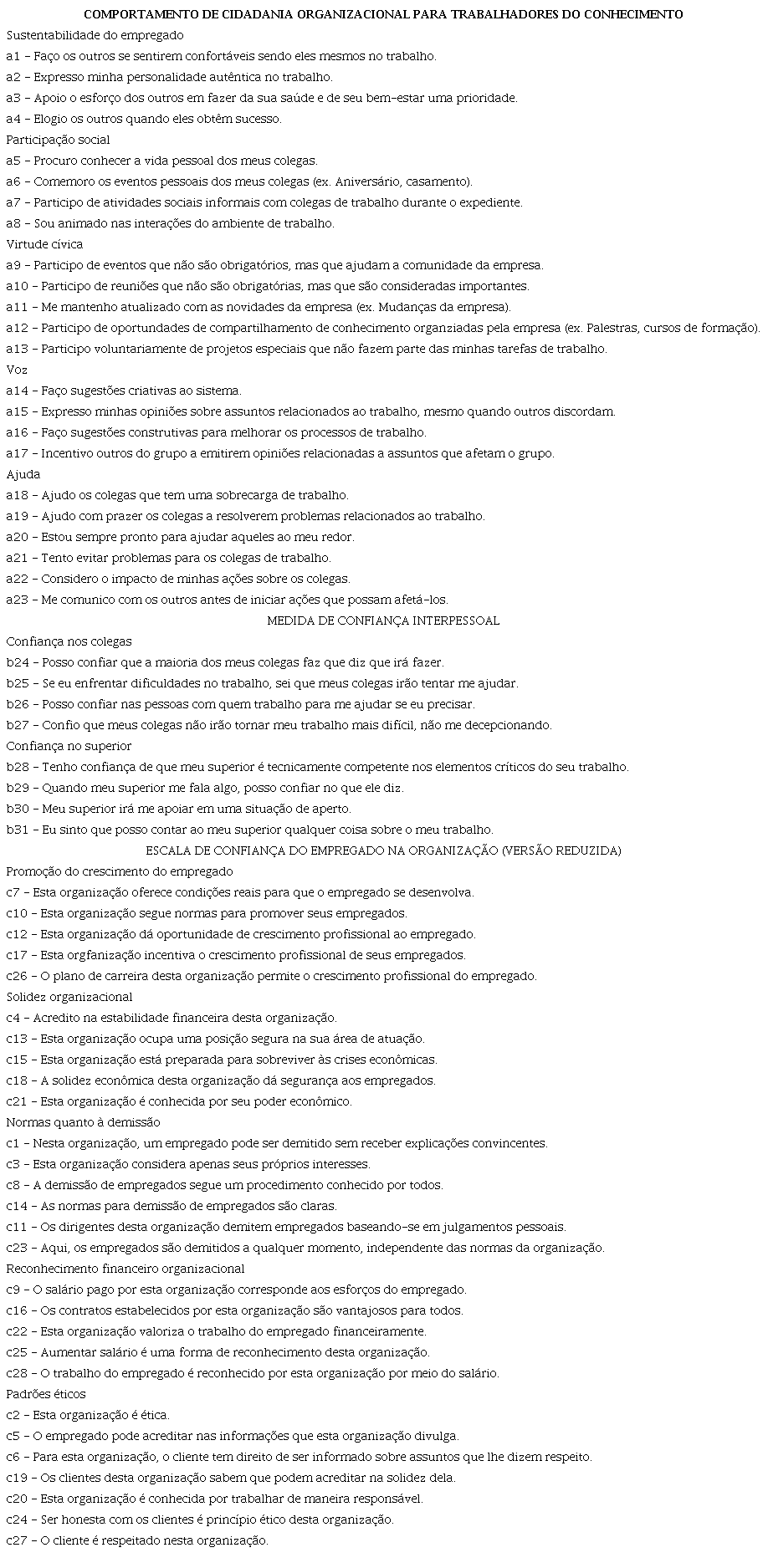 A escala de Comportamentos de Cidadania Organizacional para Trabalhadores do Conhecimento (CCO-TC) foi replicada em inúmeras amostras e sua confiabilidade foi satisfatória, com Alphas de Cronbach entre 0,78 e 0,88 (DEKAS, 2010; DEKAS et al., 2013). Destas categorias, três se alinham com as dimensões de cidadania existentes na literatura: virtude cívica, voz e ajuda. Outras duas categorias, sustentabilidade dos colaboradores e participação social, foram dimensões propostas no modelo desenvolvido por Dekas et al. (2013). Para os referidos autores, estas dimensões emergiram no contexto social relacionado aos trabalhadores do conhecimento, onde as transformações do mundo do trabalho foram significativas nas últimas décadas.