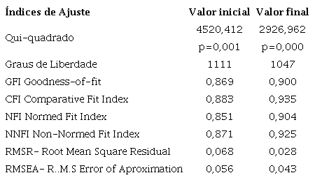 Com relação aos índices de ajuste, foram consideradas as medidas absolutas (Qui- quadrado, RMSR, RMSEA e GFI) e comparativas (CFI, NFI e NNFI). Frente aos pressupostos desses índices, constatou-se que o modelo inicial não estava em conformidade com os valores aceitáveis, indicando a necessidade de ajustes no modelo.
