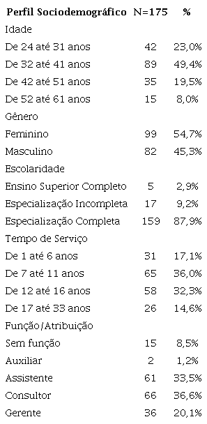 Do total de participantes (N=175), quase metade dos respondentes (49,4%) possuía idade entre 32 e 41 anos. A média da idade correspondeu a 38 anos, o que apontou para um perfil de empregados mais experientes. Em relação ao gênero dos respondentes, a predominância foi de pessoas que se declararam do sexo feminino (54,7%). A maior parte dos respondentes (36,0%) possuía entre 7 a 11 anos de serviço na empresa e possuía pós-graduação completa (87,9%), demonstrando ter um perfil qualificado.