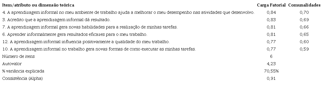 O fator empírico identificado diz respeito ao quanto às práticas informais de aprendizagem natural ou espontânea no trabalho geram resultados positivos sob a ótica do indivíduo. Este resultado, atrelado ao desempenho orientado para ações e soluções de problemas no ambiente de trabalho, corrobora achados de Conlon (2004) e Touré, Michel e Marty (2017), que revelaram que aprendizagem informal advém de questões do cotidiano, necessária à resolução de problemas e inovação, e que são imprescindíveis à melhoria da performance (SVENSSON; ELLSTRÖM; ABERG, 2004; JACOBS; PARK, 2009).