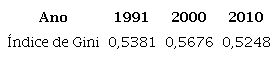 Entretanto, mesmo com o aumento do PIB, o índice de Gini não apresentou variação significativa, passando de 0,5381 em 1991 para 0,5248 em 2010 (Tabela 2). Neste período de 20 anos, parece que o “bolo cresceu”, mas sua partilha continua desigual.