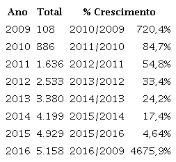 Outro dado a cerca dos pequenos empreendimentos que merece destaque é o número de Microempreendedores Individuais (MEI) na cidade. Em 2009, havia 108 MEI registrados em Rio Grande. Já em 2016, o número passou para 5.158, o que representa um crescimento de mais de 4.000% em sete anos (PORTAL DO EMPREENDEDOR, 2017). Embora o crescimento total no período apresente números impactantes, o crescimento vem caindo gradativamente, como demonstra a Tabela 3.