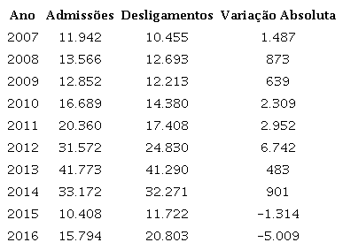 Os anos de 2010, 2011 e 2012 foram os que apresentaram as maiores variações absolutas positivas do período. Embora o número de empregos gerados tenha aumentado substancialmente nesse período, os desligamentos cresceram em proporções semelhantes, ambos provavelmente impulsionados pela constante movimentação e troca de empregos ocorrida, sobretudo, na indústria naval. Na série observada, os únicos anos a apresentar variação absoluta negativa foram 2015 e 2016, evidenciando os efeitos da crise em Rio Grande. O setor de serviços liderou o número de desligamentos de trabalhadores na cidade em 2015, com um total de 4.174 demissões, seguido do Comércio, com 3.744, e da Indústria de Transformação, com 2.627 demissões (BRASIL, 2017).