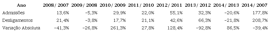 De 2007 a 2013 (ano de maior volume de produção da indústria naval), houve crescimento significativo no número de admissões, como evidenciam as Tabelas 4 e 5. A variação absoluta do número de admissões e demissões registrados em Rio Grande demonstra o movimento de trabalhadores que são absorvidos e lançados ao exército industrial de reserva a cada ano.