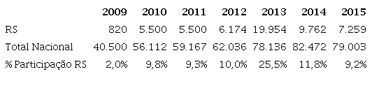 O número total de trabalhadores empregados nos estaleiros do RS, em Janeiro de 2015, correspondeu a 9,2% do total da indústria naval brasileira. A trajetória do emprego nos estaleiros gaúchos apresenta, desde 2009, um crescimento constante cujo ápice foi no ano de 2013, quando correspondia a 25,5% do total de empregos no setor. Após a crise da indústria naval, esse número caiu pela metade em 2014, ficando em 11,8%, até chegar aos 9,2% no começo de 2015 (SINDICATO NACIONAL DA INDÚSTRIA DA CONSTRUÇÃO E REPARO NAVAL E OFFSHORE, 2015). A Tabela 7 apresenta esses números mais detalhadamente.
