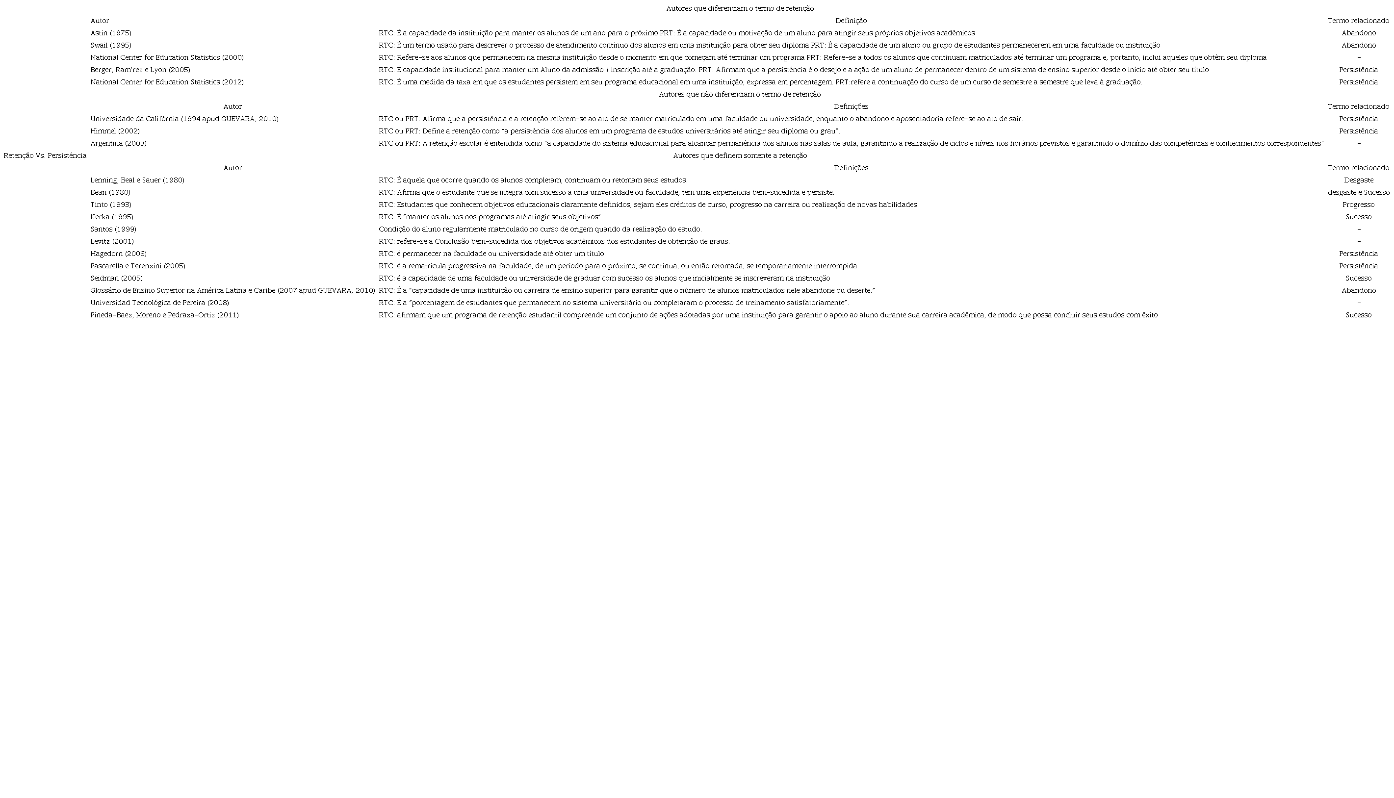 Mesmo depois de mais de oito décadas de pesquisa sobre retenção, a definição de retenção de estudantes, ainda permanece ambígua, não havendo um consenso entre os estudiosos do assunto. Summerskill (1962) é talvez um dos primeiros a solicitar o desenvolvimento de padrões nacionais em relação à definição e mensuração da retenção, incluindo taxas de retorno e conclusão anual. Em uma investigação feita pela Universidade Nacional da Colombia (2002), é relatado nos estudos, que não há diferença entre os termos retenção e persistência. No entanto, uma revisão de literatura internacional sobre o assunto permitiu estabelecer que alguns autores consideram importante diferenciar esses dois termos. O Centro Nacional para Educação Estatística dos Estados Unidos corrobora com a segunda linha, e explica que a retenção institucional é definida como a porcentagem dos alunos que completam um programa, ou mantêm inscrição em sua primeira instituição, e, a persistência, é a porcentagem de estudantes que completam um programa ou mantem sua inscrição em qualquer nível de instituição pós-secundário (NATIONAL CENTER FOR EDUCATION STATISTICS, 2000). Alguns termos podem ter significados diferentes fora do contexto do estudo. No contexto da educação superior a retenção é percebida como um fenômeno positivo na medida em que os alunos permanecem na universidade para alcançar o objetivo desejado, mesmo diante de fatores complexos e multidimensionais (culturais, sociais, institucionais e individuais). A maioria das definições apresentadas são de autores internacionais, especialmente norte-americanos. O termo relacionado à retenção, conforme cada autor e a definição por estes empregadas estão descritos na coluna termo relacionado. Após a revisão das definições adotados pelos autores e termo relacionado ao processo de retenção, se estabelece uma definição mais adequada com base neste estudo. O Quadro 1 representa os autores que diferenciam e não diferenciam os termos retenção e persistência, assim como autores que definem somente retenção.