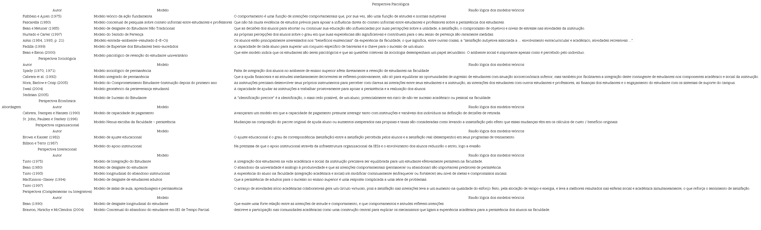 Parte dos modelos teóricos construídos nas últimas cinco décadas foram desenvolvidos para analisar o fenômeno do abandono, no entanto sua estreita relação com a retenção de estudante pavimentou a aplicação dos mesmos para estudos de retenção, mediante observações das características e restrições de cada teoria. A abordagem dos modelos de retenção de estudantes no ensino superior tem sido analisada pelos pesquisadores com base em seis perspectivas teóricas: a psicológica, a sociológica, a econômica, a organizacional, a interacional e a complementar ou integrativa, que compreende as perspectivas (sociológicos, econômicos, organizacionais e psicológicos). A perspectiva psicológica se concentra nos atributos da personalidade do indivíduo. Em contrapartida, a perspectiva sociológica, não se concentra no individual, mas sim nas forças sociais que são externas a instituição educacional como status social, raça e prestígio. A perspectiva econômica se concentra no financiamento financeiro individual que afeta a retenção de estudantes. A perspectiva organizacional está em causa com o impacto de fatores organizacionais, como estrutura burocrática, tamanho e proporção de estudantes. A perspectiva interacional se concentra na influência da interação de indivíduos e fatores ambientais na retenção de estudantes. A perspectiva complementar ou integrativa compreende múltiplas perspectivas (sociológicos, econômicos, organizacionais e psicológicos). Considerando a breve apresentação dos modelos teóricos de retenção de estudantes na seção anterior, essa seção, em forma de resumo, e para a melhor visualização dos resultados alcançados, apresenta-se no Quadro 2, a perspectiva, autor, modelo e razão logica como relatado na literatura.