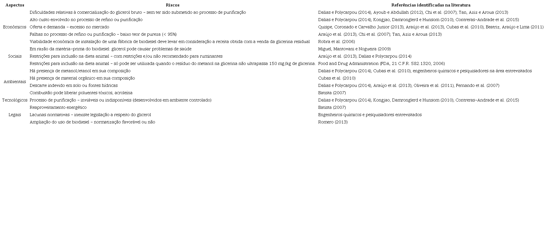 Por fim, categorizou-se as restrições identificadas em relação à destinação do glicerol conforme os aspectos sustentáveis contemplados neste estudo, além dos legais e tecnológicos. Assim, os riscos identificados na literatura são apresentados no Quadro 1.