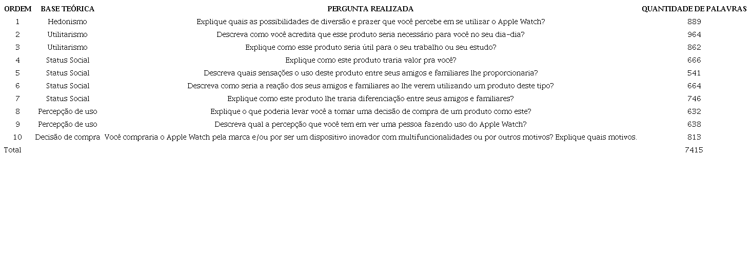 A pesquisa é caracterizada como qualitativa devido à coleta de dados ser baseada em contextos, conteúdos e descrição das análises textuais analisadas (BOGDAN; BIKLEN, 1994). Logo, foi desenvolvido um questionário estruturado com questões abertas, tendo como objetivo incentivar respostas reflexivas e profundas (AMADO, 2013). Conforme a Tabela 1, tal questionário foi composto por dez questões discursivas que abordam conceitos baseados na literatura e em teorias discutidas neste estudo, como o hedonismo, utilitarismo e status social, dividindo-se em quatro perguntas relacionadas ao status social (dado a relação com o utilitarismo e hedonismo), duas perguntas envolvendo o utilitarismo, duas perguntas referente à percepção de uso, uma pergunta abordando os valores hedônicos (envolvendo as características gerais de prazer e satisfação) e uma pergunta relacionada à decisão de compra. Por fim, foram realizadas perguntas ligadas aos dados socioeconômicos dos participantes, tais como nome, idade, profissão, sexo, estado civil para assim se definir o perfil dos respondentes.