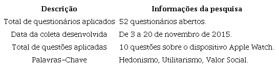 A distribuição destes questionários se deu de maneira presencial por meio de material impresso, com o objetivo de abranger um maior número de pessoas possíveis. Os respondentes se caracterizaram por serem indivíduos com idades entre 18 e 40 anos, sendo estudantes universitários e profissionais residentes no município de Belém/ Pará, que comumente utilizam tecnologias móveis no seu dia a dia como smartphones, tablets, notebooks entre outros. O questionário continha uma imagem do dispositivo para que os indivíduos entrevistados pudessem avaliar o produto em relação a sua utilidade e a predição de uso e consumo, a fim de obter informações sobre suas percepções relacionadas ao Apple Watch. Os questionários foram aplicados por um dos pesquisadores que realizou um processo de descrição detalhada do questionário, para depois deixar os participantes livres para explicarem suas percepções quanto ao produto inserido, dado o estímulo na apresentação inicial do instrumento de coleta. O Quadro 1 representa as informações ligadas aos dados primários extraídos durante a pesquisa realizada.