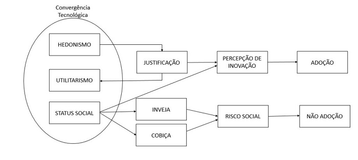 Sendo assim, as atribuições de funcionalidades e prazer passam a gerar um significativo papel na adoção e no uso de novas tecnologias (CHITTURI et al., 2007). Diante disso, o processo de aceitação tecnológica depende das características hedônicas, sem excluir a possibilidade de uso das características utilitárias convergidas no dispositivo, pois o utilitarismo passa a ter um papel fundamental na justificação de consumo por parte do consumidor (ARRUDA FILHO; DHOLAKIA, 2013).