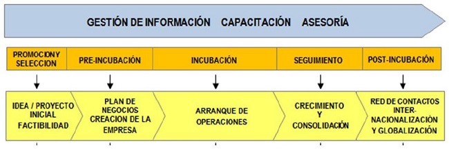 Etapa de Incubación - Se ofrecen servicios integrales para desarrollar capacidades incubadas, diversas habilidades y estrategias, además de guiar el proceso de operación y desarrollo de la empresa. Este proceso se concreta con la graduación de la empresa o con su rechazo. Esta etapa dura un promedio de 12 a 18 meses.