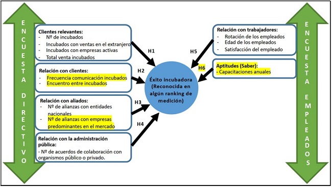 En la Figura 2 se muestra el modelo utilizado en la investigación, considerando: Hipótesis General: éxito incubadora de negocios (Reconocida en ranking de medición). Hipótesis Específicas: