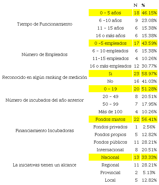 Los antecedentes generales que presentan las incubadoras de negocios de América Latina participantes son: el 46,15% tiene un tiempo de funcionamiento de 0 a 5 años, el 43,59% cuenta con una plantilla de empleados de 0 a 5, sin embargo la cantidad que lo sigue con un 30,77% cuenta con una plantilla del mayor rango, de 16 o más empleados, el 58, 97% ha sido reconocido en ranking de medición, el 51,28% presenta una cantidad de incubados de 0 a 19 durante el año, el 56,41% se financia mediante fondos mixtos y el 33,3% tiene un alcance nacional.