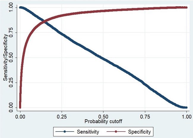 The standard model with a cutoff of 0.50 can more accurately predict the no events than the events. To better balance between sensitivity and specificity, it is necessary to change the cutting point. The statistical relationship between sensitivity, specificity and cutoff (cutoff) can be displayed graphically for better understanding of the necessary adjustments (FÁVERO et al., 2014). The analysis of the graph allows visualization of the curves to identify what would be a new and appropriate cutoff point for what is intended in the operative analysis.