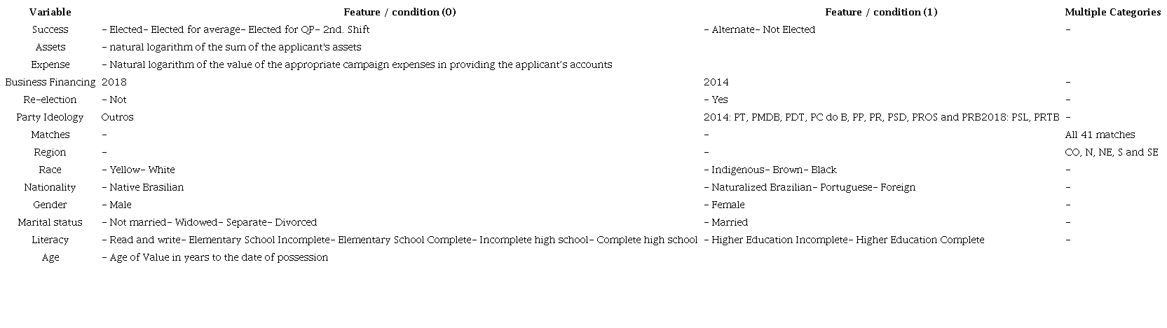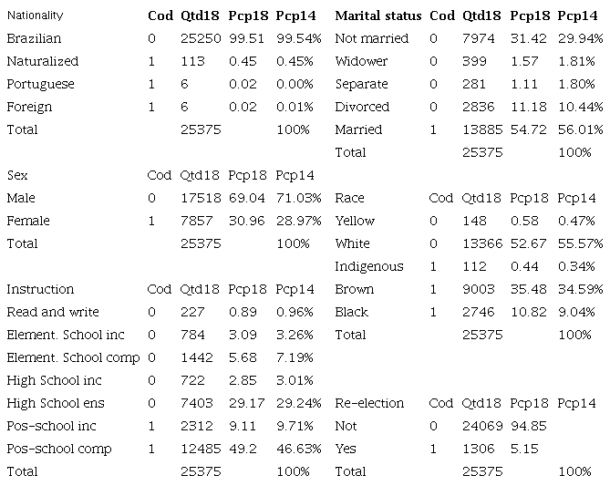 Based on the concepts described above variables (see Table 1) were built based on the available data of the population, after procedures described in the methodology, the applicants reached 25,376 in the election 2018, and 21,514 in the 2018. The dichotomous variables have a default value of zero, and the existence of the characteristic displays the value 1.