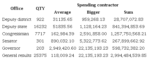 Campaign spending, considering the appropriate expenditure by candidates, reached BRL 2.99 billion, spent by 17 647 candidates, because that 7728 candidates do not declare the realization of campaign expenses. Other 1627 candidates declared having made expenditures of up to BRL 1,000.00. Considering all the candidates, the average is BRL 118,000 in expenses accrued by each candidate. The parties perform other campaign spending, in general, to promote or make more effective the party's image, but because they are not allocated to the applicants, no longer considered.