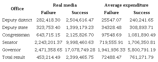 Sallaberry, Rodrigues and Vendruscolo (2014) found that in some cases the resources invested in campaign not based on economic and geographic reasons. In this case, the descriptive title, you can see with reasonable logic that campaigns to more important positions require greater investment in the campaigns, possibly to publicize their proposals. Candidates for District Deputy positions have lower average amounts spent than the analogous office of State Representative, and the geographical extent is also lower in the Federal District.