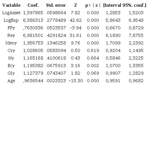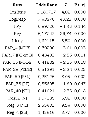 The variable indicative of empirically tested entrepreneurial financing also showed an influence, however, on the odds ratio (FEy Coef. 0.763 p = .0000) divergent from that expected. This divergence may be due to several factors, including the interest groups involved with the candidates (MANIN; PRZEWORSKI; STOKES, 2006) at times of political turmoil. Another possibility is that the financial resources of organizations are enough to skew the entire electoral process, including resulting in contradictory choices.