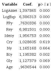 The logistic regression model also allows you to identify the chance of occurrence of event of interest to the change in one unit the corresponding explanatory variable through the logistic command (FÁVERO; BELFIORE, 2017). The amount applied to the drive of interest is evidenced by the odds ratios for each explanatory variable, highlighted in Table 9.